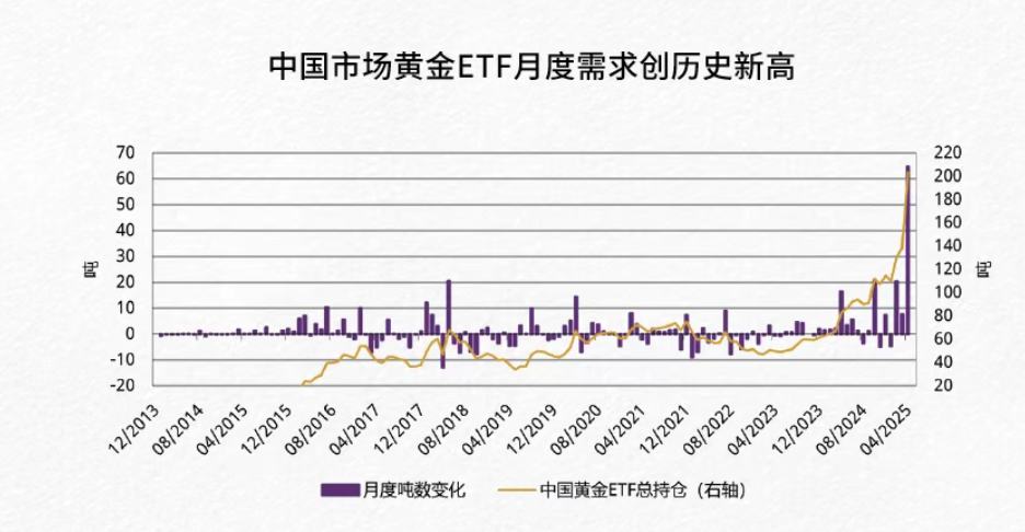 4 月,中国市场黄金 ETF 流入约 490 亿元人民币,已连续三个月保持强劲流入。资产管理总规模 (AUM) 激增至 1580 亿元人民币,双双刷新记录高位。人民币金价的卓越表现、中美贸易摩擦引发的担忧、国内债券收益率因货币政策宽松预期而下以上因素联合促成了此次空前的需求激增态势。